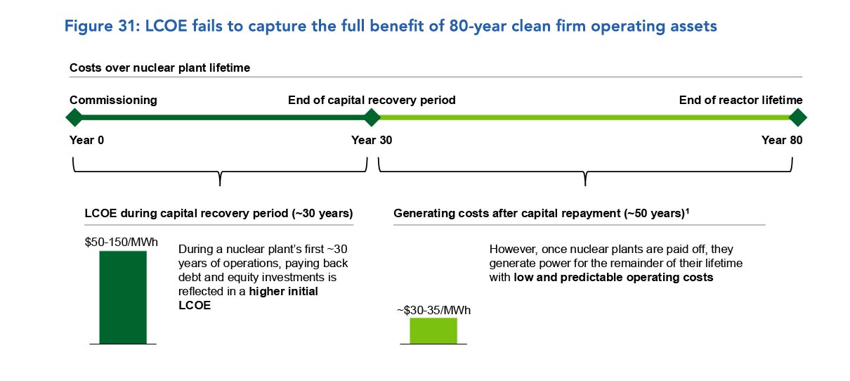 En av svakhetene ved å bruke LCOE som mål på kostnader er at metoden ikke tar hensyn til levetiden til energikildene. Mens sol- og vindkraftverk har en levetid på rundt 25 år, kan kjernekraftverk driftes i opptil 100 år – noe som også er tilfelle for vannkraftverk. Dette betyr at det må bygges fire nye vindkraftverk for hver gang det bygges ett kjernekraftverk. Når man ser på levetiden og de totale kostnadene i et samfunnsøkonomisk perspektiv, er kjernekraften overlegent. Når kjernekraftverkene er nedbetalt, vil de kunne levere billig strøm i mange tiår uten behov for store investeringer. Dette gir kjernekraft en langsiktig verdi tilsvarende vannkraft, og dette bør både partiene og samfunnet ta hensyn til.