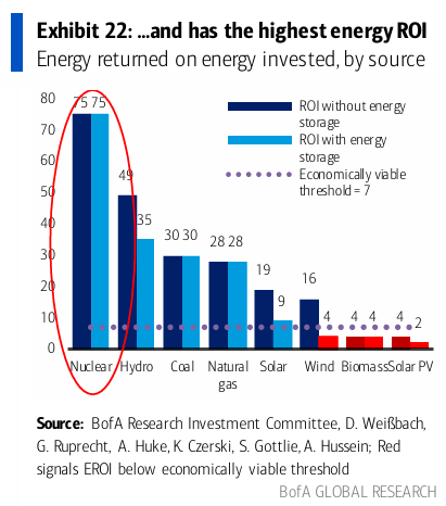 Kjernekraft har ifølge BofA en EROI på 75, langt høyere enn både solkraft (19) og vindkraft (16). Når man inkluderer behovet for energilagring, synker EROI for solkraft til 9 og vindkraft til 4. Dette betyr at de nærmer seg, eller faller under, det som regnes som økonomisk bærekraftig for et samfunn (EROI rundt 7). Dette er ikke problematisk per i dag, rett og slett fordi kraftverkene bygges med fossil energi. I framtiden vil dette derimot ha stor betydning. For kjernekraft er det imidlertid ingen slike utfordringer, og det gjør kjernekraft til en svært effektiv energikilde i det grønne skiftet.