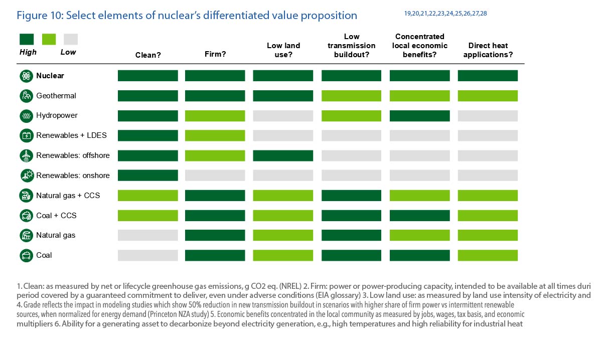 Selv om økonomi er viktig, handler energipolitikk også om klima, natur og helse. Både DOE og BofA vurderer kjernekraft som en av de reneste og mest bærekraftige energikildene. Den produserer svært lave CO2-utslipp, krever lite areal og bruker minimale mengder materialer sammenlignet med fornybare alternativer. Kjernekraft regnes også som en av de tryggeste energikildene, en vurdering som støttes av en omfattende rapport fra FNs UNECE. DOE sin rapport fremhever kjernekraft som den eneste energikilden som scorer høyt på alle parametere for bærekraft, inkludert pålitelighet, arealbruk, nettutbyggingsbehov, økonomiske fordeler for lokalsamfunnet, og muligheten for å bruke varme.