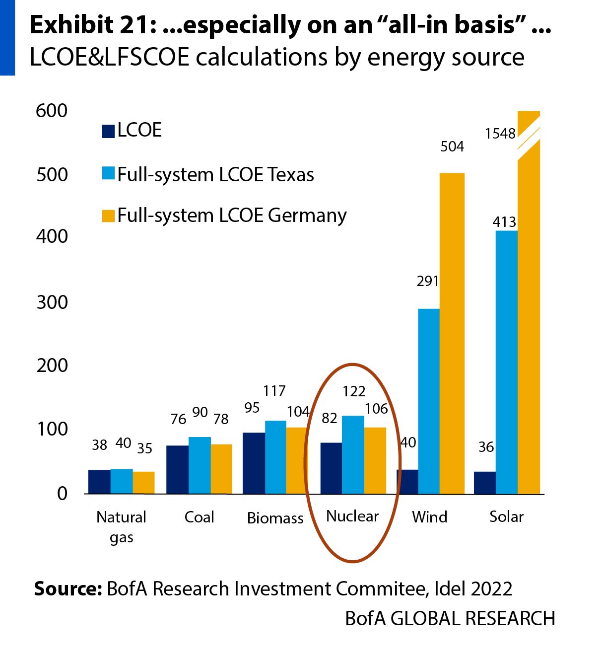 I Tyskland er LCOE for kjernekraft, vindkraft og solkraft henholdsvis 82, 40 og 35 øre per kWh (forutsatt en valutakurs på 10 NOK/USD), ifølge BofA-rapporten. Når vi inkluderer de totale systemkostnadene, er derimot bildet motsatt. For kjernekraft blir den samlede kostnaden 106 øre/kWh, mens vindkraft stiger til 504 øre/kWh og solkraft hele 1548 øre/kWh. Dette viser at kjernekraft på lang sikt er langt rimeligere enn væravhengig fornybar energi når alle kostnader tas med.