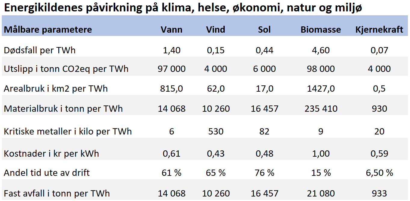 Da må vi ikke bare ta hensyn til klima, men også natur, miljø, helse og økonomi. Vi må se på energikildenes samlede negative påvirkning , altså det totale fotavtrykket.